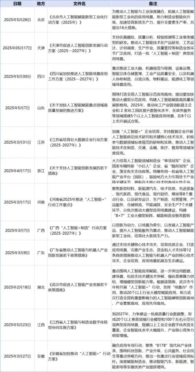 从地方政策来看,自从2025年《政府工作报告》中提出要持续推进“人工智能+”行动之后,各地政府纷纷结合自身产业特色,出台人工智能专项政策,已有北京、天津、四川、山东、江苏、浙江、河南、广西、广东、安徽等省市出台了人工智能专项行动,并针对制造业领域有相应的规划,如表1所示。