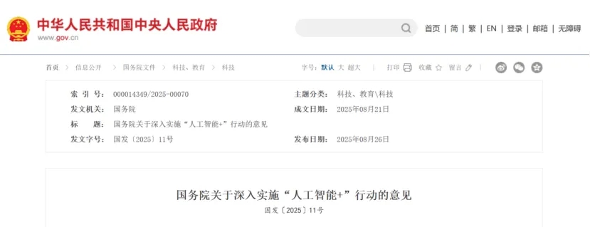 2025年8月26日,国务院印发《关于深入实施“人工智能+”行动的意见》,要求以科学技术、产业发展、消费提质、民生福祉、治理能力、全球合作等领域为重点深入实施“人工智能+”行动。