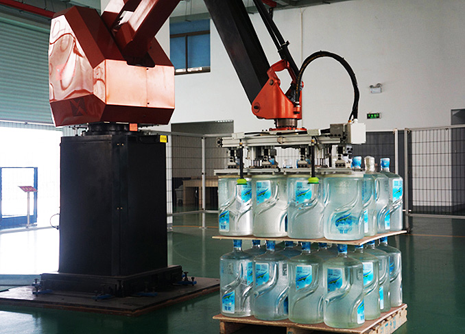 智能桶码垛系统是将装入桶等的物料或者是经过包装和未经包装的规则物品,按一定排列码放在托盘(木质)上,进行自动堆码,可堆码多层,然后推出,便于继续进行下一步包装或者叉车运至仓库储存。码垛机实现智能化操作管理,可大大地减少劳动人员和降低劳动强度。