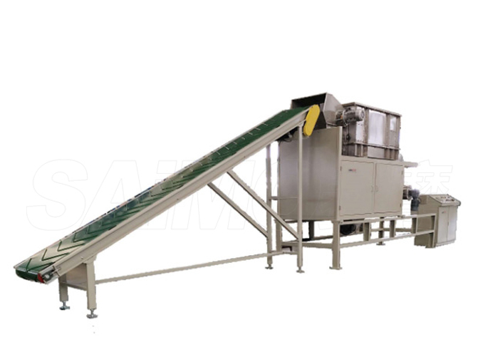 单包拆包机是一种包装袋自动拆包机械,通过皮带机自动给袋,入料口配有割刀横向转动进行破袋,袋子切开数个开口落入滚筛,滚筛带动袋子转动,分离物料落入下料斗,废袋被螺旋钢带分离。