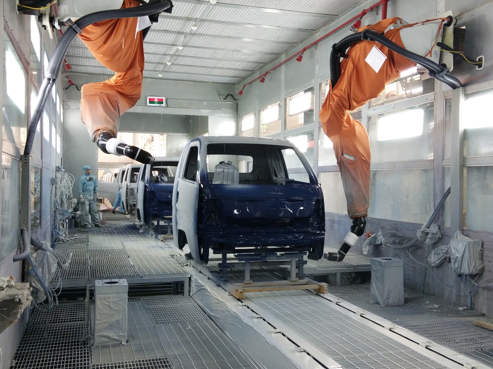 该项目为某卡车整车喷涂项目,系统采用ABB喷涂机器人,可对不同车型的卡车进行柔性喷涂。